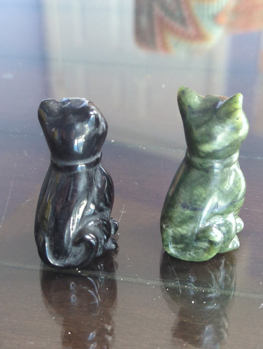 Obsidian & Jade Cat Carvings - Hand-Carved Gemstone Statues (5.5cm)